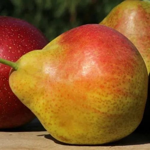 - Симметричной грушевидной формы, золотисто-жёлтого, с буровато-красным, цвета. Мякоть крайне приятная, сочная, кремового цвета;